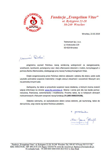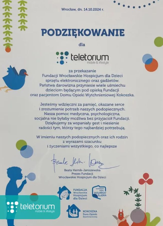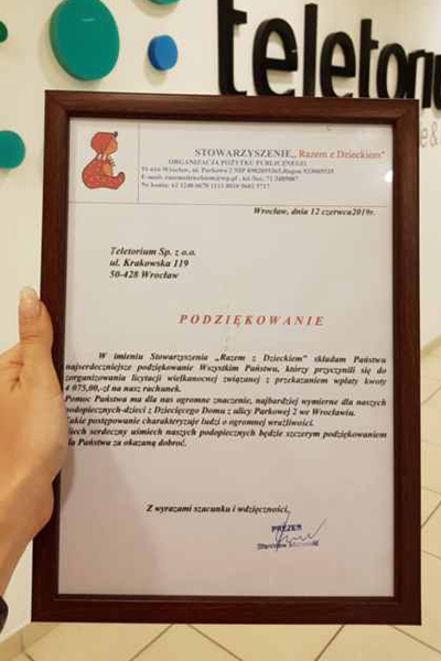 Teletorium to przede wszystkim wspaniali ludzie. Zgrany zespół, który troszczy się o realne potrzeby społeczności, która nas otacza i z którą się identyfikujemy. Nasi pracownicy cechują się ogromną chęcią pomocy płynącą z dobroci serca. „Być zawsze pod ręką” – nasze hasło przewodnie sprawdza się zarówno w biznesie jak i życiu codziennym. Jesteśmy wszędzie tam, gdzie nas potrzebują – dotyczy to Klientów oraz osób wymagających wsparcia. Każdy pomysł jest dla nas ważny, dlatego wielkość akcji nie ma dla nas znaczenia.